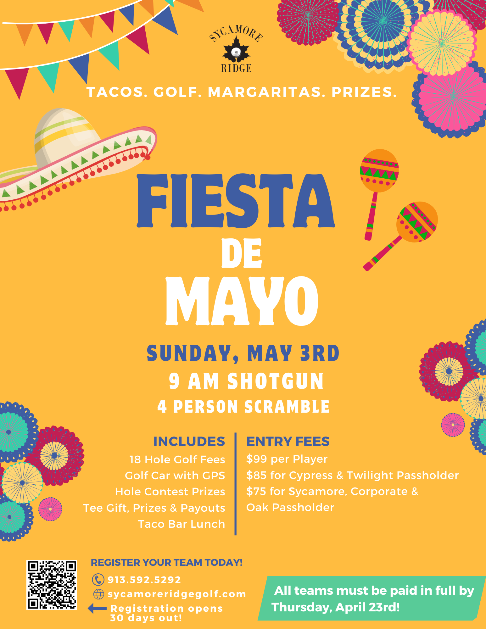 Join us for Fiesta De Mayo! 9 AM Shotgun. 4 Person Scramble. Includes 18 holes with a Golf Car with GPS, Tee Gift, Hole Contests, Prizes, & Payouts, and Taco Bar Lunch.